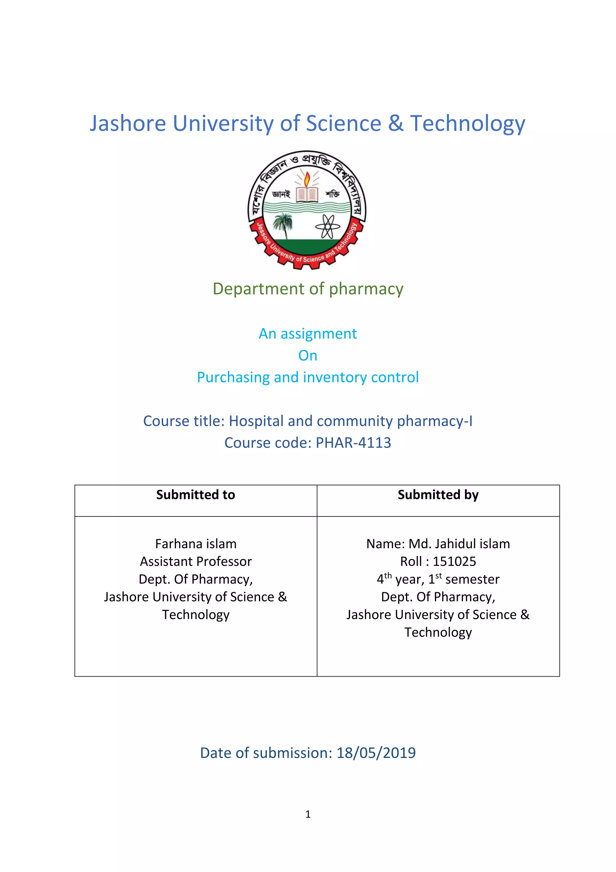 This document provides information about purchasing and inventory control in a hospital pharmacy setting. It defines key terms like purchasing, types of purchasing, and functions of purchasing. It describes the roles of the purchasing agent and pharmacist in drug procurement. It outlines the purchasing procedure and discusses controlling purchases, storeroom arrangement, inventory processes, and perishable inventory. The document is an assignment on this topic submitted by a pharmacy student to their professor.