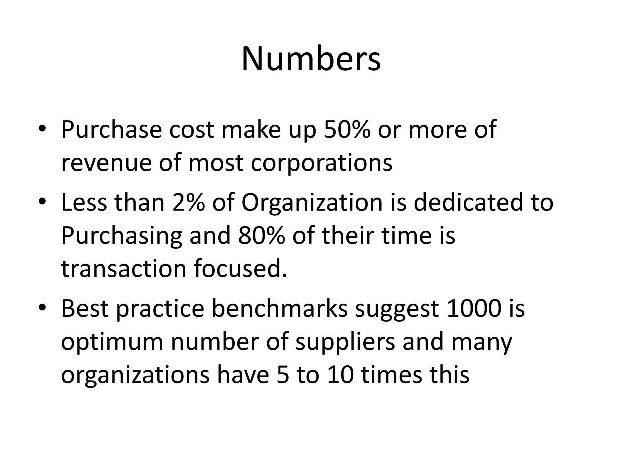 The document discusses purchasing benchmarks and a call to action for strategic sourcing. It notes that purchasing makes up 50% or more of revenue for most companies but less than 2% of organizations are dedicated to purchasing. The optimal number of suppliers is around 1000 but many companies have 5-10 times that amount. The document calls for managing purchased materials and services to reduce costs through supplier improvement, demand analysis, and strategic sourcing best practices like market analysis, cost modeling, and sourcing methodology. The goal is to obtain the best total cost.