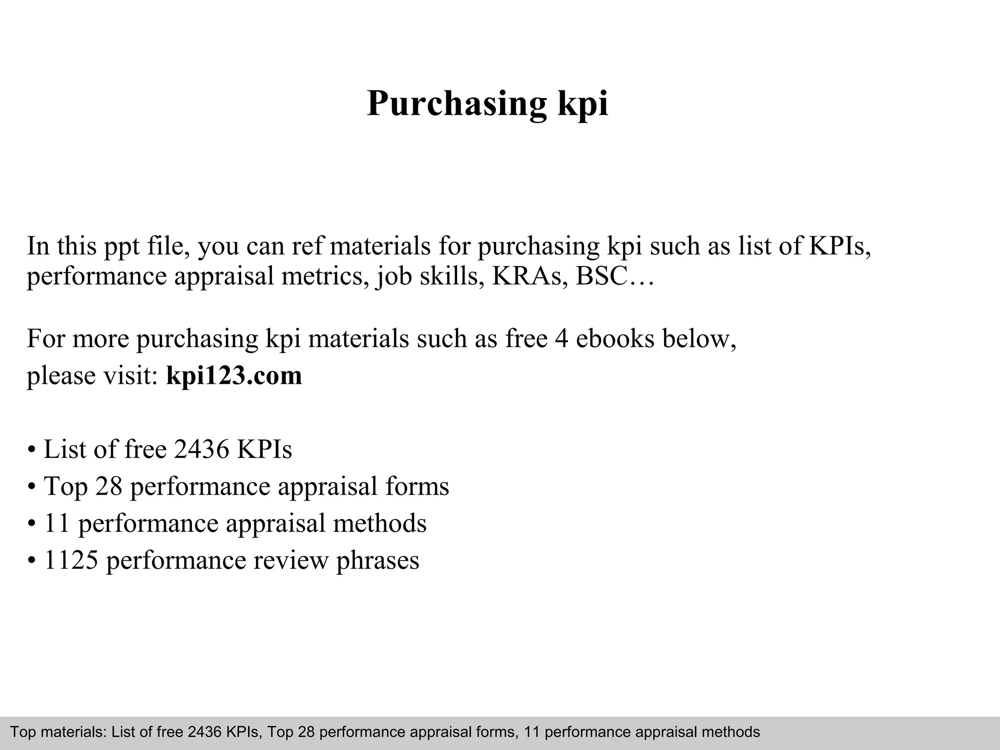 This document discusses key performance indicators (KPIs) for purchasing roles. It provides information on developing KPIs, including defining objectives, identifying key result areas and tasks, and determining methods to measure results. The document outlines common mistakes in creating KPIs, such as having too many KPIs not linked to key result areas. It also describes different types of KPIs, such as process, input, output, leading, lagging, outcome, qualitative and quantitative KPIs. Resources for purchasing KPI materials like ebooks and examples are provided.