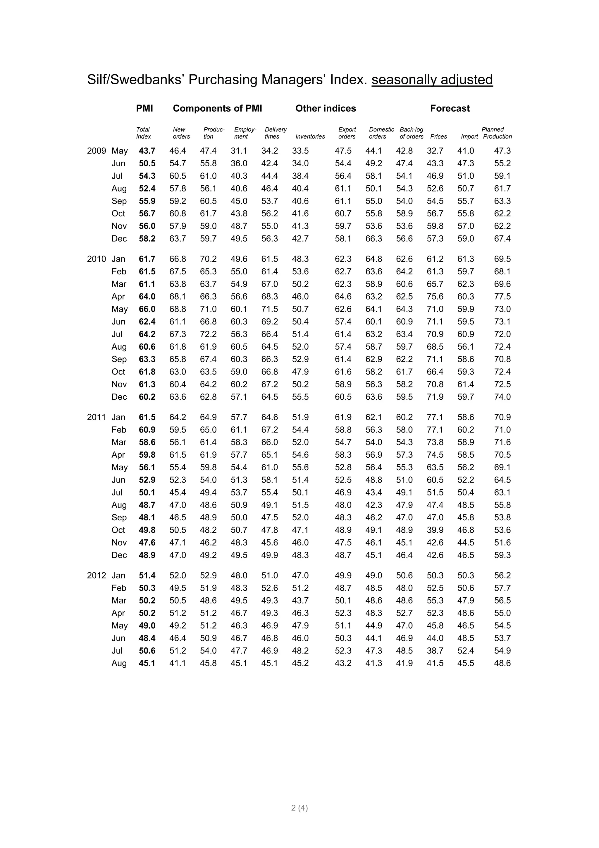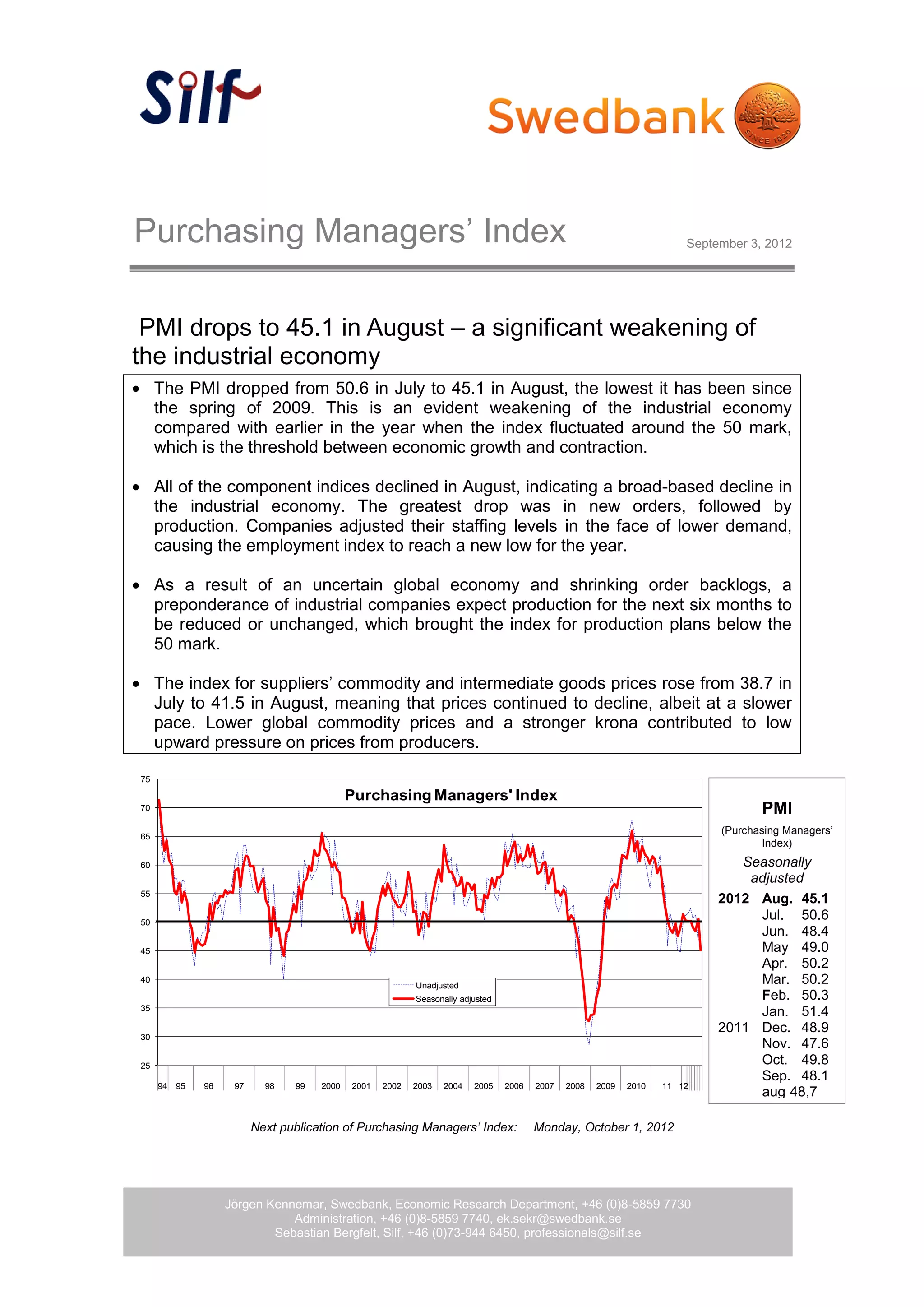 The Purchasing Managers' Index (PMI) fell to 45.1 in August 2012, indicating a significant decline in the industrial economy and marking the lowest level since spring 2009. All component indices showed decreases, especially new orders and production, prompting companies to reduce staffing due to lower demand. The uncertain global economy has led many industrial firms to anticipate production cuts or stagnation in the coming months.