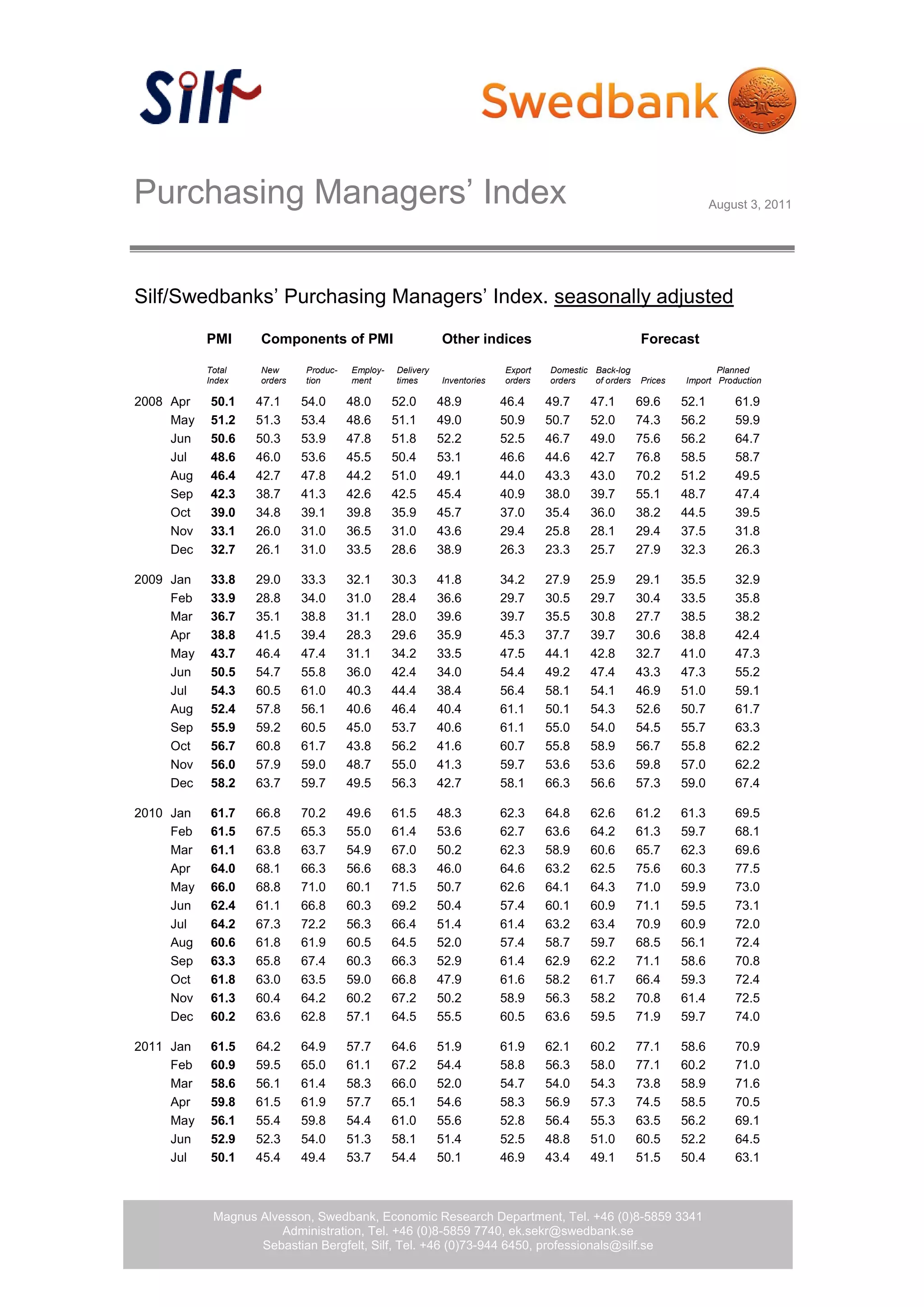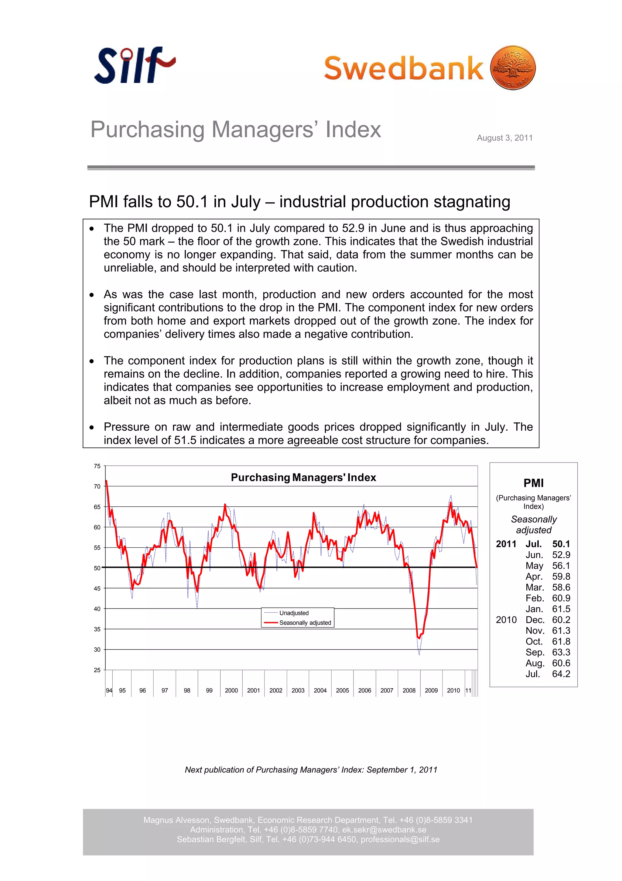 The Purchasing Managers' Index (PMI) fell to 50.1 in July from 52.9 in June, indicating stagnation in the Swedish industrial economy. The decline was attributed primarily to decreased production and new orders, with home and export markets showing negative trends. Despite these challenges, companies still reported a need to hire, suggesting potential for future growth, while cost pressures on raw materials eased.