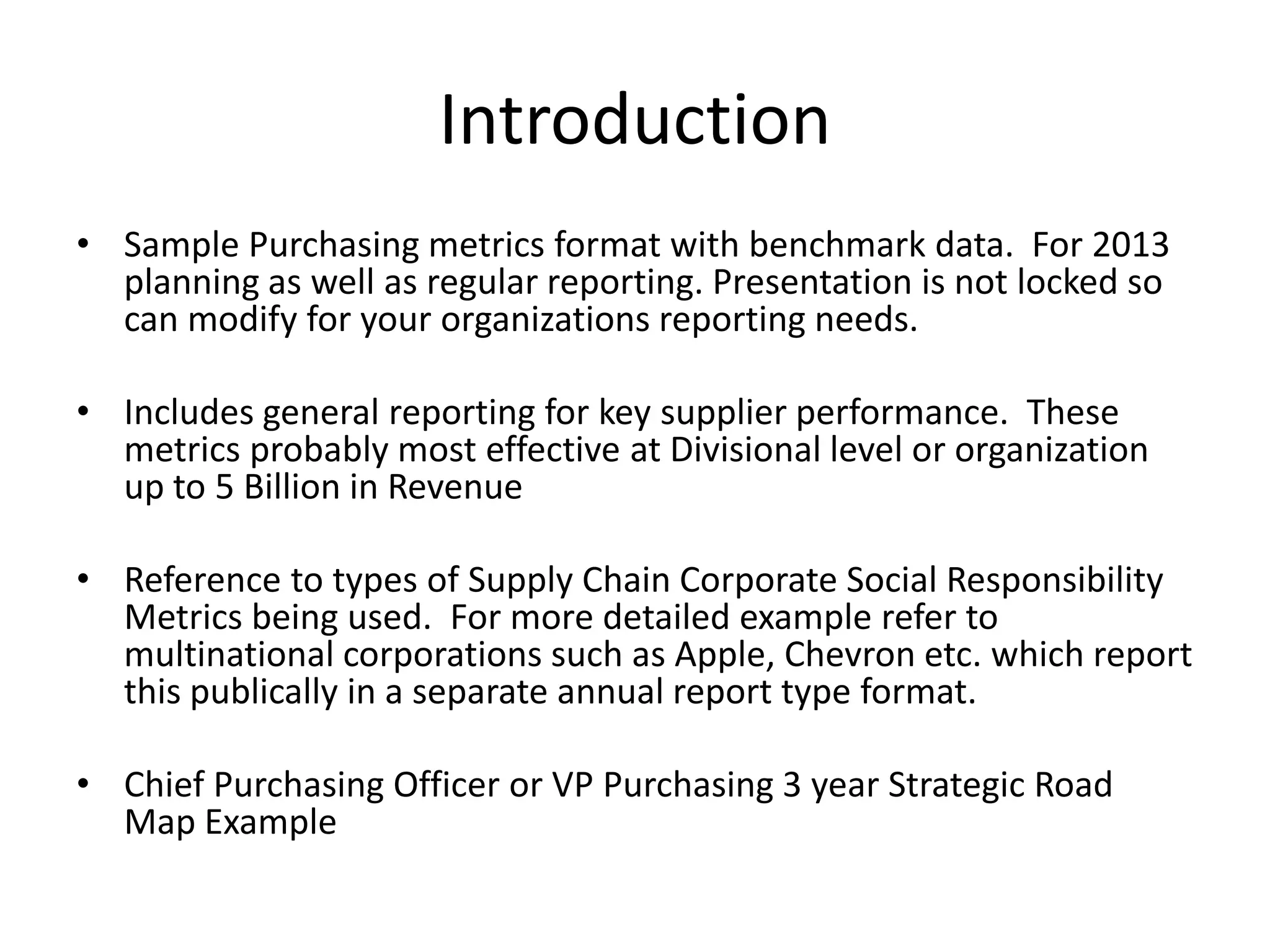 The document outlines a purchasing metrics dashboard prepared for 2013 planning and quarterly updates, including customizable formats for organizational reporting. It details key supplier performance metrics and corporate social responsibility metrics adopted by companies, referencing examples from multinational corporations. Additionally, it presents benchmarks for purchasing expenses and suggests a three-year strategic roadmap for enhancing purchasing operations through data tools and training.