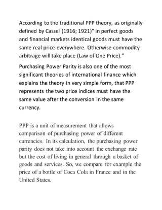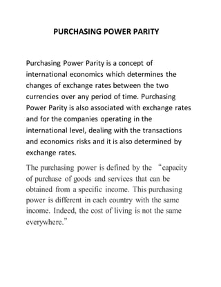 Purchasing power parity (PPP) is a concept in international economics that determines exchange rate fluctuations over time based on differences in purchasing power and cost of living between countries. PPP holds that identical goods should have the same real price after currency conversion. It aims to measure purchasing power of currencies by comparing the prices of common goods and services in different countries rather than using exchange rates alone. PPP is one of the most significant theories in international finance for understanding how exchange rates adjust to equalize the purchasing power of different currencies.
