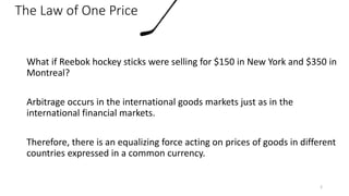 The document discusses the theory of purchasing power parity (PPP). It defines PPP as the principle that identical baskets of goods should have the same price when expressed in a common currency if not for trade barriers. Absolute PPP suggests prices levels should be equal across countries, while relative PPP suggests inflation differentials should equal exchange rate depreciation. The document provides examples of how PPP can be used to estimate exchange rate levels and changes. It also discusses factors like transaction costs and non-traded goods that can cause deviations from PPP in practice.