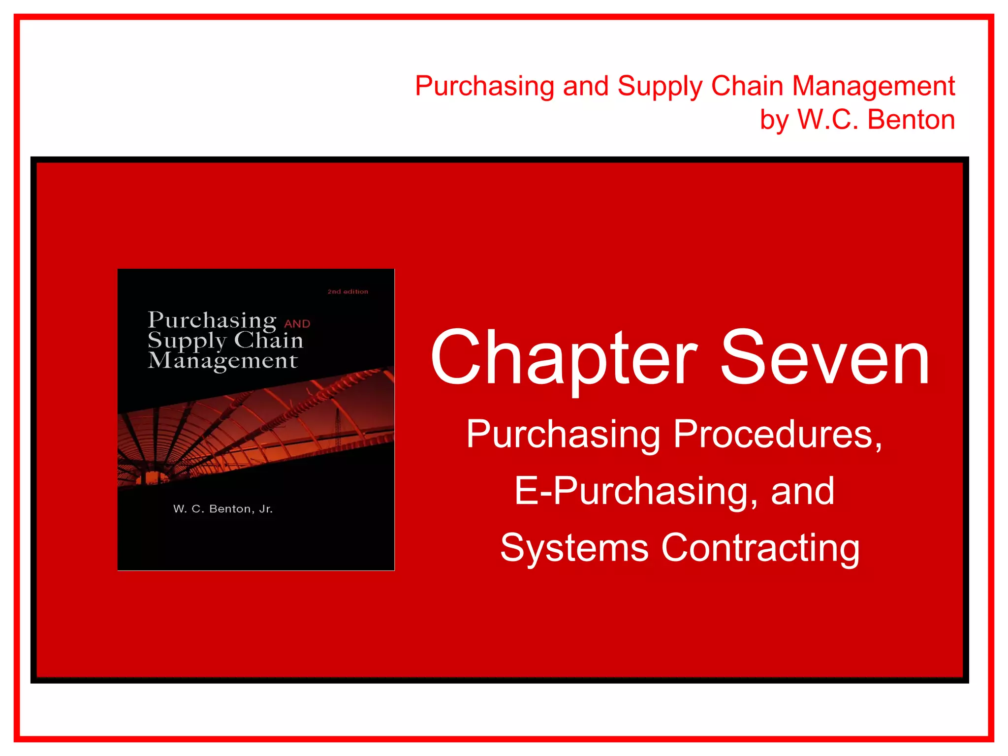 The chapter discusses purchasing procedures, e-purchasing, and systems contracting. It identifies the typical steps in the conventional purchasing cycle as requisitioning materials, determining suppliers, issuing purchase orders, expediting deliveries, receiving materials, and processing invoices. E-purchasing can reduce costs for indirect materials like office supplies through electronic ordering and reverse auctions. However, direct materials purchasing requires close supplier relationships not suited for e-procurement. Electronic data interchange (EDI) allows electronic transmission of orders and invoices but implementation requires overcoming resistance to change.
