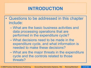 This chapter discusses the expenditure cycle, which involves ordering, receiving, and paying for goods and services. It describes the basic activities in the cycle as ordering, receiving/storing items, and payment. It also discusses important decisions like inventory levels and vendor selection. Finally, it covers different inventory control methods like EOQ, MRP, and JIT as well as the role of IT in improving purchasing functions through tools like EDI, vendor-managed inventory, reverse auctions, and procurement cards.