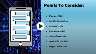 ALOHA is a simple communications scheme where each transmitter sends data whenever it has a frame to send. There are two versions: Pure Aloha, where time is continuous and not synchronized, and stations transmit whenever they have data; and Slotted Aloha, where time is divided into slots and stations can only transmit at slot boundaries. Pure Aloha was introduced in 1970 at the University of Hawaii to connect users to a central computer using low-cost radio equipment. The maximum throughput of Pure Aloha is 18% of the total transmitted frames.