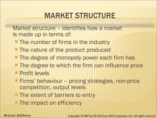 The document discusses market structure and perfect competition. It defines market structure as considering the number of firms, nature of products, degree of monopoly power, and other factors. Economists group markets into four structures: pure competition, monopolistic competition, oligopoly, and pure monopoly. The document then focuses on defining pure competition, including that it involves many small firms, standardized products, firms being price takers, and free entry and exit. It also discusses the demand, costs, revenues, and equilibrium outcomes for competitive firms.