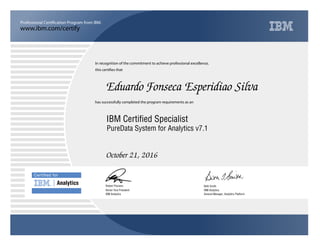 This document is a certificate from IBM certifying that Eduardo Fonseca Esperidiao Silva has successfully completed the IBM Analytics Certified Specialist program for PureData System for Analytics v7.1, as verified by signatures from Beth Smith, General Manager of Analytics Platform, and Robert Picciano, Senior Vice President.