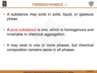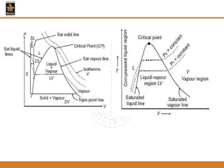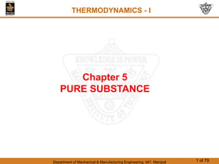 The document discusses pure substances and their properties. It defines a pure substance as one that is homogeneous and has a constant chemical composition across all phases. A pure substance can exist as a solid, liquid or gas, and its chemical makeup remains the same in each phase. The document also describes phase diagrams and equations of state for pure substances, and methods for determining the dryness fraction of steam using calorimeters.