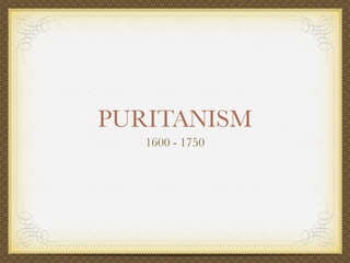 Puritans immigrated to America in the 1600s to escape religious persecution in England. They settled in Massachusetts with the goal of creating a theocratic society where they could freely worship God. Puritanism emphasized hard work, discipline, and aiming for moral perfection to please God. They established Harvard University and schools to educate followers. Though Puritanism declined by 1750, it greatly influenced American culture by stressing the importance of education, hard work, and the idea that God rewards righteousness.