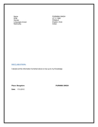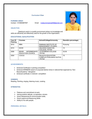 Purnima Singh is seeking a position that utilizes her knowledge and skills to contribute to organizational growth. She has an MBA from RAMAIAH INSTITUTE OF MANAGEMENT STUDIES and a B.B.M from ANUGRAH NARAYAN COLLEGE. Her strengths include patience, positive attitude, good communication and reasoning skills. She has achieved awards in painting and fashion competitions and enjoys reading, painting, singing and more in her free time.