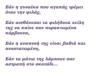 Puro amor 1. 2. Εάν η γυναίκα που αγαπάς τρέμει όταν την φιλάς , Εάν αισθάνεσαι τα φιλήδονα χείλη της να καίνε σαν πυρακτωμένα κάρβουνα , Εάν η αναπνοή της είναι βαθιά και αναστατωμένη , Εάν τα μάτια της λάμπουν σαν αστραπή στο σκοτάδι … 3. 4.