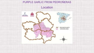 The document discusses purple garlic that is grown in Pedroñeras, Spain. It describes the appearance of the purple garlic plant and bulb. The main uses of purple garlic in cooking are to flavor dishes, both raw or cooked, and it can be used in various cuttings. A recipe for atascaburras that uses purple garlic is also included.