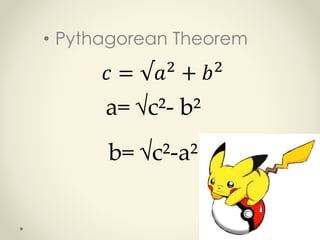 The document discusses applying the Pythagorean theorem to solve for unknown sides of right triangles. It provides the formula c2 = a2 + b2 and shows steps for using it to find the length of the diagonal of a billboard that has sides of 5 meters and 12 meters. These steps include illustrating the triangle, writing the given values, substituting them into the formula, squaring the given values, adding them, taking the square root of the sum to find that the length of the diagonal is 13 meters.