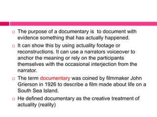 Documentaries document real events or situations using actual footage or reconstructions, with or without narration. The term was coined in 1926 by filmmaker John Grierson to describe a film about life on a South Sea Island. While documentaries present facts, their ultimate goal is to use those facts to make socially critical arguments and invite audiences to draw their own conclusions.