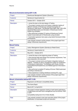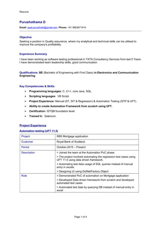Purushothama D is seeking a position in quality assurance where he can utilize 5 years of experience as a software testing professional at TATA Consultancy Services. He has skills in programming languages like Java, SQL, and scripting languages like VBScript. He has experience with manual and automation testing using tools like QTP, UFT, and Selenium. Notable projects include regression testing of web applications for The Home Depot, and testing a warehouse management system for Sainsbury's Supermarket including designing automated test frameworks. He was awarded certificates of achievement for his work and received "On the Spot" awards twice for his performance.
