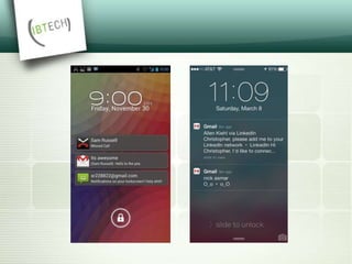 Push notifications allow software applications to deliver messages and notifications to users without requiring the user to actively check for updates. Push notifications can contain data, notifications, or both. There are two main platforms for delivering push notifications: Firebase Cloud Messaging (FCM) for Android and Apple Push Notification Service (APNs) for iOS. Both support delivering notifications via HTTP and XMPP/MQTT protocols. iOS 10 introduced enhancements like rich notifications that allow images, videos, and interactive buttons in notifications. It also introduced notification extensions that give developers more control over customizing notification content.