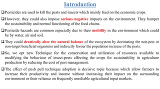 Push-pull technique was developed in the 1990s in Kenya to manage pest populations through intercropping and trap crops that release semiochemicals. It involves intercropping a main crop with a repellent plant ("push") and bordering the field with an attractive trap crop ("pull") that concentrates pests away from the main crop. For cereal stem borers in East Africa, the technique uses desmodium as the push intercrop and Napier grass as the pull trap crop, with Napier grass attracting and killing over 80% of stem borer larvae through its sticky sap. This reduces pest damage to the main cereal crop while increasing yields by up to 2 tons/hectare.
