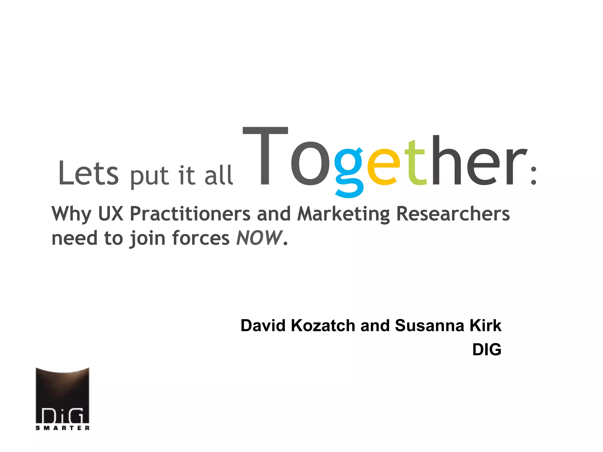 The document discusses how UX practitioners and marketing researchers need to work more closely together. While they have different focuses and methodologies, combining their expertise could help organizations better understand users and customers. Emerging technologies also provide new opportunities for gathering insights. By sharing information and collaborating, UX and marketing teams can create more effective digital experiences that are both usable and persuasive.