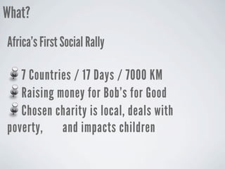 The Put Foot Rally is a 17-day, 7,000 km social rally across 7 African countries to raise money for Bob's for Good, a charity that deals with poverty and impacts children. A team of four do-gooders - Storm Bell, Meryl Currie, Tim Krause, and Mark Smith - are committing to the rally. The document outlines a marketing plan for brands to sponsor the rally, gaining national radio coverage, social media promotion, and creating an ongoing online presence, with an estimated return on investment of 8.1 times the sponsorship cost. The goal is to empower communities and help the 7 million school children in need across Southern Africa while also providing an adventure for the participants.