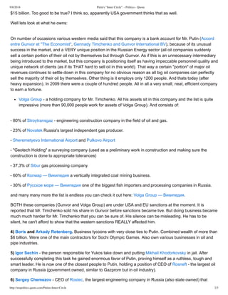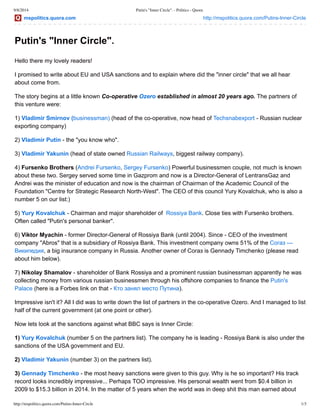 This document discusses Vladimir Putin's inner circle in Russia and those affected by sanctions from the US and EU. It identifies the original partners in Putin's cooperative from the 1990s, including Vladimir Yakunin, Yury Kovalchuk, and Nikolay Shamalov. It describes how Gennady Timchenko amassed a large fortune controlling energy companies like Gunvor and gas giant Novatek. The document also notes how Boris and Arkady Rotenberg, Igor Sechin of Rosneft, and Sergey Chemezov of Rostec are among Putin's closest allies facing sanctions.