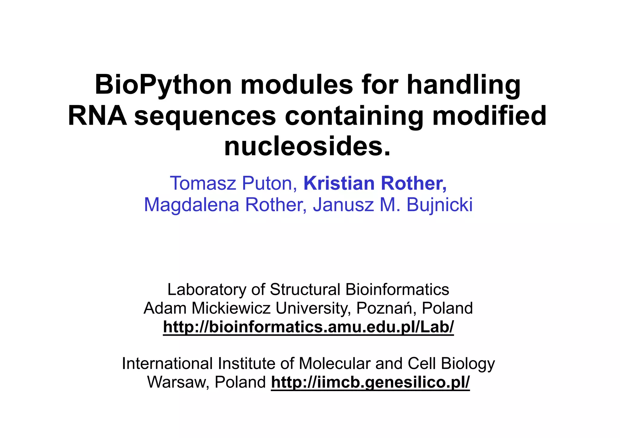 This document discusses BioPython modules for handling RNA sequences containing modified nucleosides. There are 115 known post-transcriptionally modified nucleosides in RNA and several nomenclature schemes exist. The solution involves cloning a branch of the BioPython repository containing an RNA alphabet with modified nucleotides and using it to represent sequences containing modifications like 2-O-methyloadenosine. Example applications presented are ModeRNA for RNA structure modeling and CompaRNA for benchmarking RNA structure prediction methods, both of which use open source tools including BioPython.