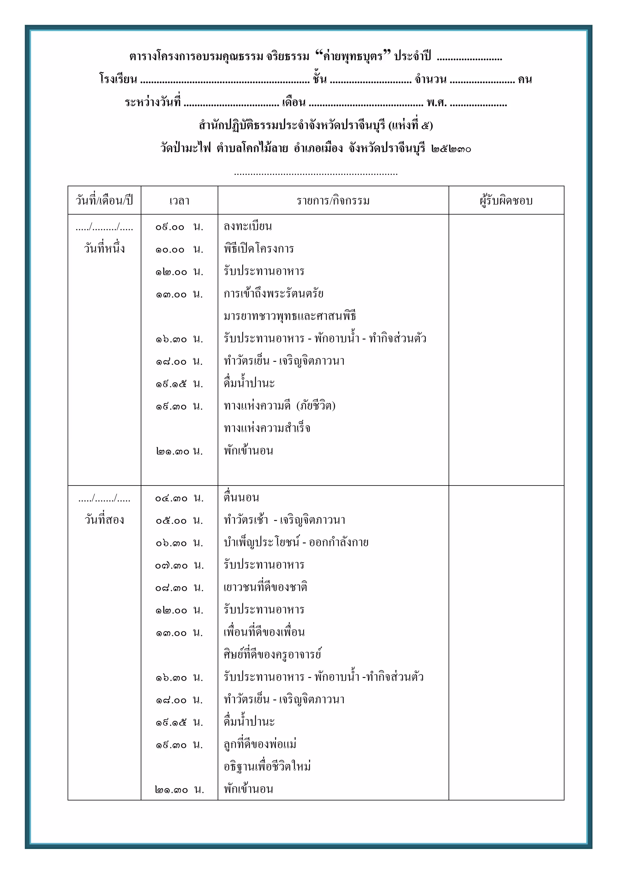 ายพุทธบุตร” ประจําปี ........................ โรงเรียน .............................................................. ชั น .............................. จํานวน ........................ คน ระหว่ างวันที! ................................... เดือน .......................................... พ.ศ. ..................... สํ านักปฏิบัติธรรมประจําจังหวัดปราจีนบุรี (แห่ งที! ๕) วัดป่ ามะไฟ ตําบลโคกไม้ ลาย อําเภอเมือง จังหวัดปราจีนบุรี ๒๕๒๓๐ ............................................................ วันที/เดือน/ปี เวลา รายการ/กิจกรรม ผูรับผิดชอบ ้ ...../........./..... ๐๙.๐๐ น. ลงทะเบียน วันทีหนึง ๑๐.๐๐ น. พิธีเปิ ดโครงการ ๑๒.๐๐ น. รับประทานอาหาร ๑๓.๐๐ น. การเข้าถึงพระรัตนตรัย มารยาทชาวพุทธและศาสนพิธี ๑๖.๓๐ น. รับประทานอาหาร - พักอาบนํ5า - ทํากิจส่ วนตัว ๑๘.๐๐ น. ทําวัตรเย็น - เจริ ญจิตภาวนา ๑๙.๑๕ น. ดืมนํ5าปานะ ๑๙.๓๐ น. ทางแห่งความดี (ภัยชีวต) ิ ทางแห่งความสําเร็ จ ๒๑.๓๐ น. พักเข้านอน ...../......./..... ๐๔.๓๐ น. ตืนนอน วันทีสอง ๐๕.๐๐ น. ทําวัตรเช้า - เจริ ญจิตภาวนา ๐๖.๓๐ น. บําเพ็ญประโยชน์ - ออกกําลังกาย ๐๗.๓๐ น. รับประทานอาหาร ๐๘.๓๐ น. เยาวชนทีดีของชาติ ๑๒.๐๐ น. รับประทานอาหาร ๑๓.๐๐ น. เพือนทีดีของเพือน ศิษย์ทีดีของครู อาจารย์ ๑๖.๓๐ น. รับประทานอาหาร - พักอาบนํ5า -ทํากิจส่ วนตัว ๑๘.๐๐ น. ทําวัตรเย็น - เจริ ญจิตภาวนา ๑๙.๑๕ น. ดืมนํ5าปานะ ๑๙.๓๐ น. ลูกทีดีของพ่อแม่ อธิ ฐานเพือชีวตใหม่ ิ ๒๑.๓๐ น. พักเข้านอน