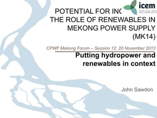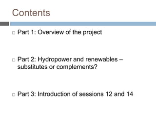 This document summarizes a project assessing the potential role of renewables in power supply in the Mekong region. It finds that renewables have significant technical potential, including over 90 GW from solar, wind, geothermal, small hydro and biomass. However, renewables face barriers to wider deployment. Hydropower currently plays a major role in centralized grid systems, while renewables are smaller-scale and connected to distribution networks. High renewable penetration will require technologies like gas or hydropower that can respond quickly to output variations. While not direct substitutes, hydropower and renewables could complement each other, with hydropower helping to integrate variable renewables. Realizing their synergies would require changes to institutional