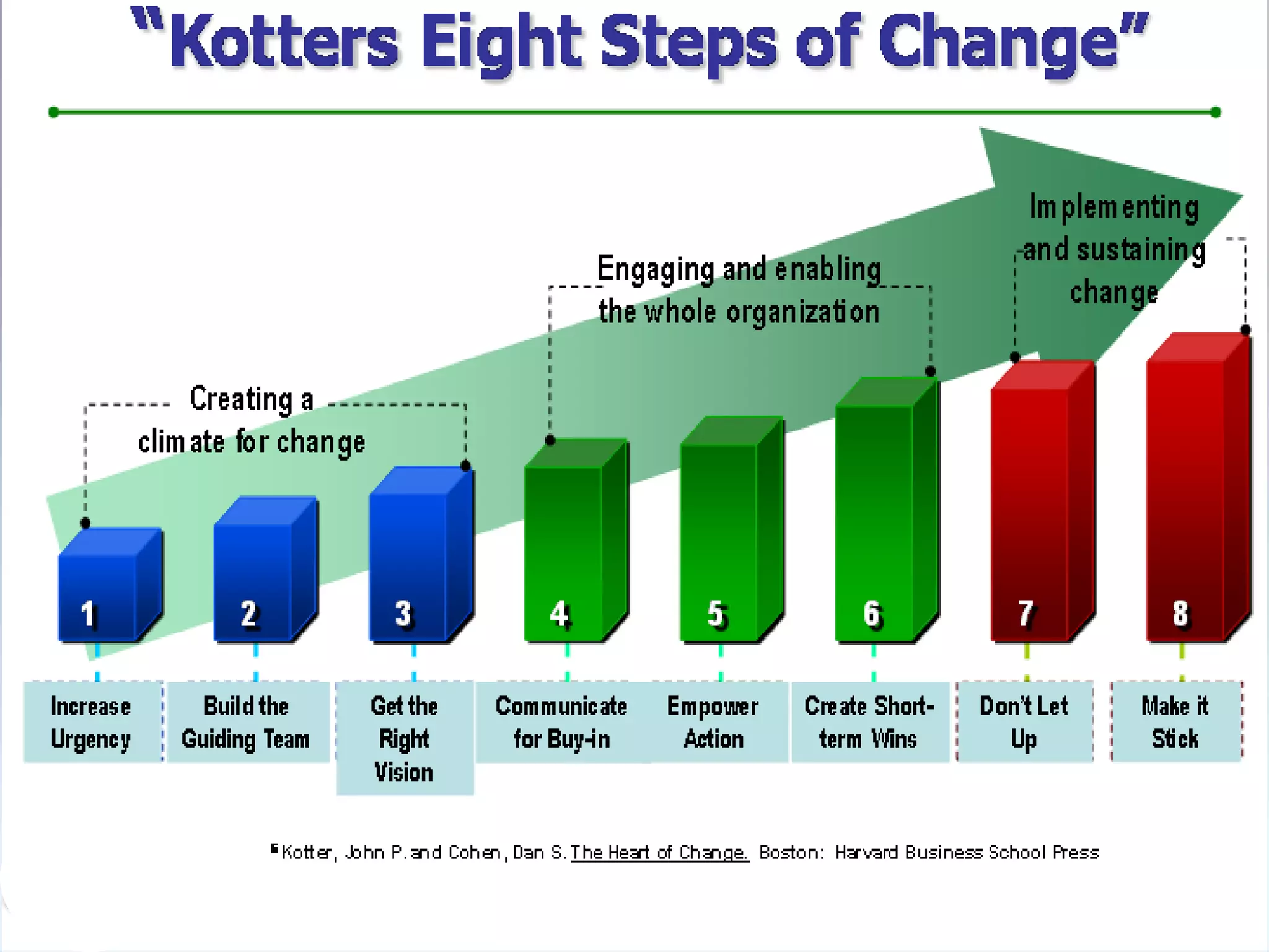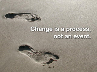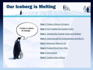 This document discusses challenges facing higher education institutions and strategies for creating and sustaining meaningful change. It identifies common concerns like student recruitment and retention, graduation rates, and accreditation. It also examines resistance to change through common myths that impede progress, such as needing a complete plan or single expert to lead change. The document advocates overcoming resistance by developing a clear vision and strategy, communicating goals, empowering others to act, and securing short-term wins to build momentum for anchoring new approaches. Key frameworks referenced include John Kotter's eight steps for leading successful organizational change.