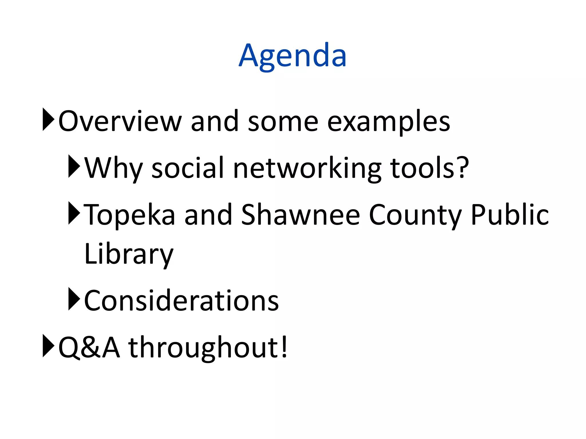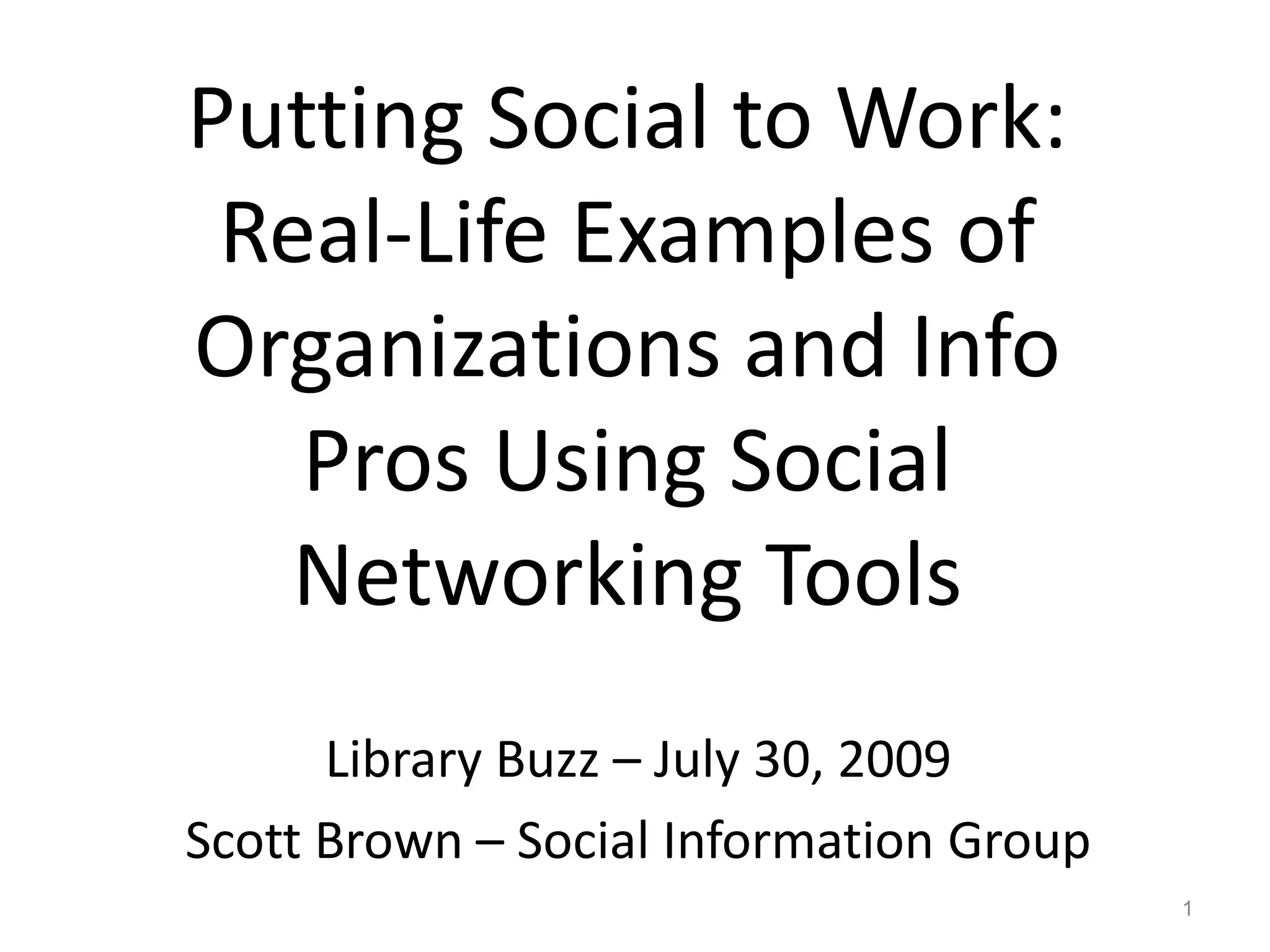 Scott Brown gave a presentation on how libraries and information professionals can use social networking tools. He discussed how tools like Twitter and Facebook have become popular ways to connect and share information. He then described how the Topeka and Shawnee County Public Library uses these tools to engage with its community and promote its resources and events. Finally, he outlined considerations for organizations in implementing social media and suggested starting with one tool, being brief and useful, and making content personal.