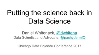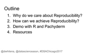 The document discusses achieving reproducibility in data science. It outlines putting the science back into data science through reproducibility. The presenter demonstrates using R and Pachyderm, an open source distributed processing framework, to build a reproducible machine learning workflow and pipeline for an iris classification model. Resources are provided for joining the Pachyderm Slack channel and accessing documentation to learn more about building reproducible data science workflows at scale with Pachyderm.
