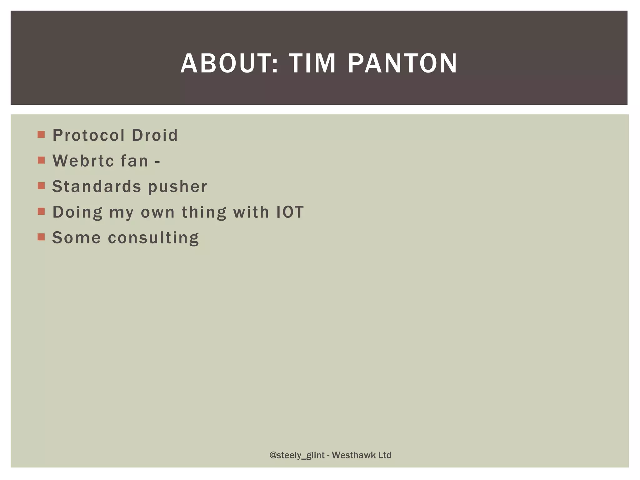 Tim Panton discusses the evolving landscape of web communication through WebRTC, emphasizing the importance of context in establishing calls. He highlights the integration of web technologies like JavaScript, WebGL, and WebAudio, showcasing innovative applications and potential for real-time communication. The document addresses practical implementations, including audio processing and remote video interactions, underscoring the rich APIs available in modern browsers for enhancing user experiences.