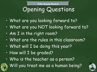 This document provides an overview of classroom policies and procedures for a 5th grade classroom. It introduces the teacher, Mr. Puttmann, and his family. It outlines the daily schedule, including times for breakfast, classes, lunch, recess. It describes classroom rules around desks, lockers, supplies, and bathroom breaks. It also discusses grading policies, homework expectations, birthday celebrations, and ending the school day. The teacher welcomes questions from students.