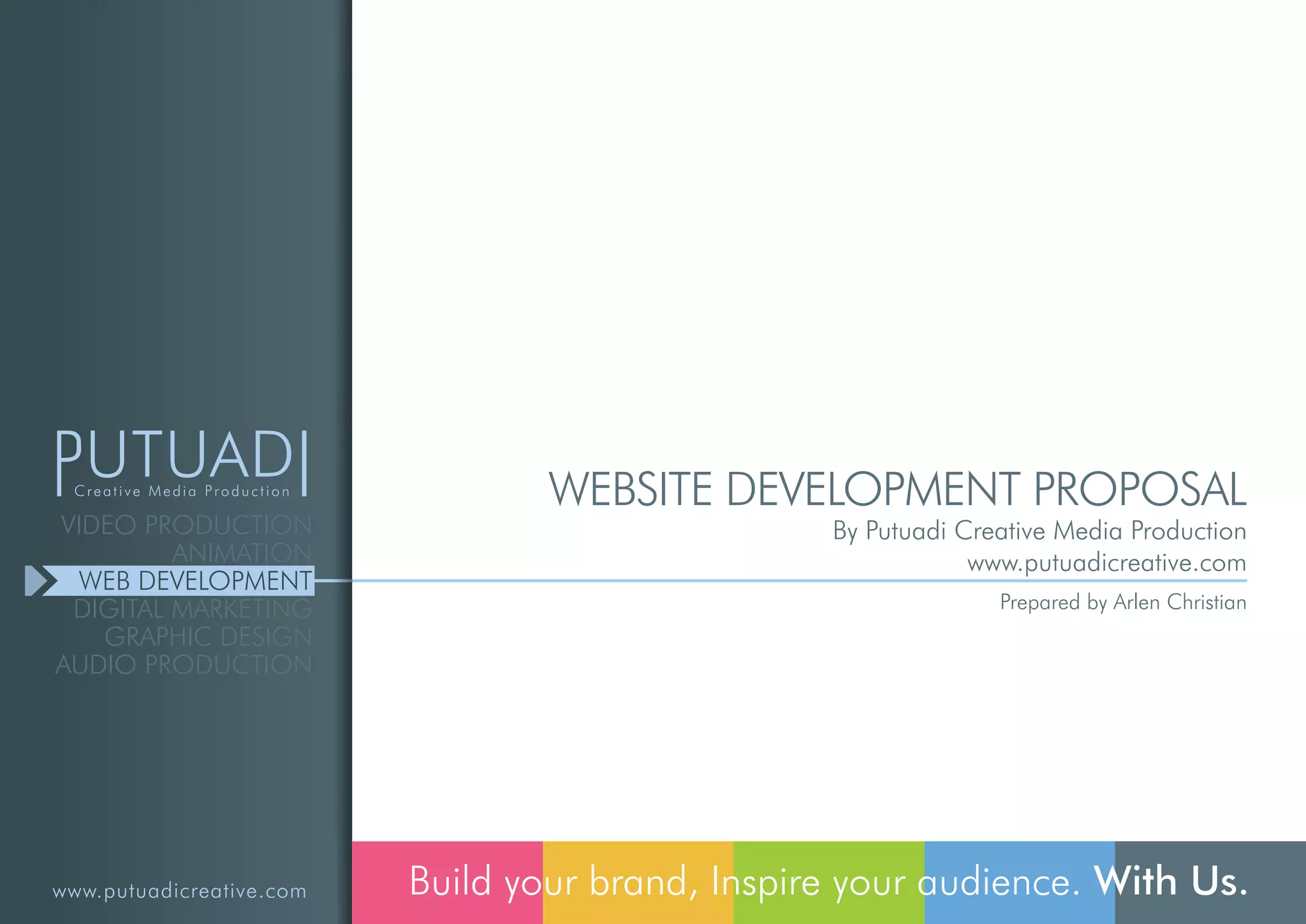 This document is a website development proposal from Putuadi Creative Media Production. It proposes a 5-step process for developing a website including research, strategic planning, design, programming, and quality assurance. The proposal estimates the total cost to be $800 USD to develop the site within 2 weeks, including 10 pages and basic features. Payment would be made in phases with a $400 deposit required upon signing and the remainder due on delivery of pages and launch. The proposal seeks to outline the full scope of work and ensure the developed site meets the client's goals and expectations.