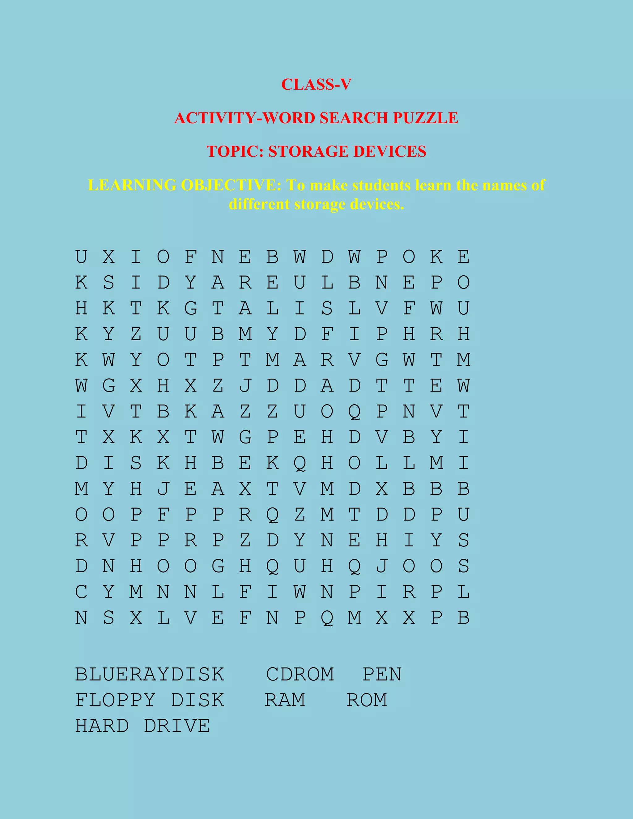 The document is a word search puzzle from a class activity about storage devices. The activity aims to teach students the names of different storage devices like Blu-ray disk, CD-ROM, floppy disk, hard drive, RAM, and ROM by having them find the words hidden in the grid.