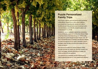 Puzzle Families offers customized family trips in Israel that can be tailored to families' interests, schedules, and budgets. They provide a wide range of activities throughout Israel such as exploring religious and historical sites in Jerusalem, riding horses in the Galilee hills, hiking in the Golan Heights, skydiving in the Carmel Mountains, and snorkeling in the Red Sea. Puzzle Families works with each family to design a unique itinerary that incorporates their desired activities, timeline, and budget to create an unforgettable experience exploring Israel.
