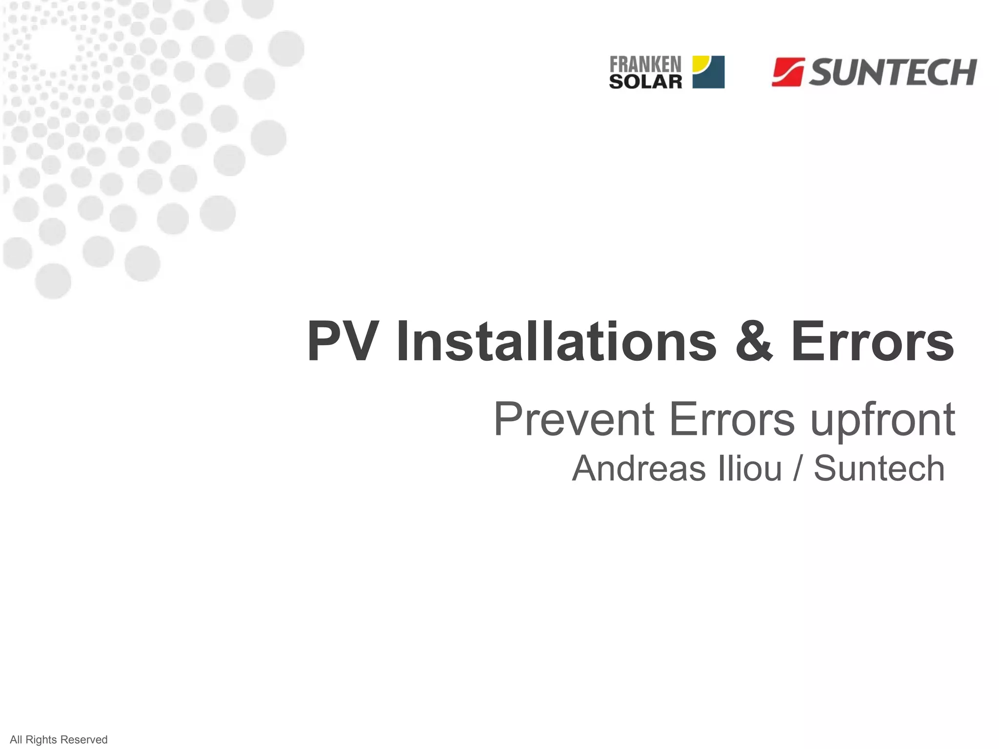 The document discusses various factors leading to reduced power output in photovoltaic systems, including installation errors, shading, and mismatched components. It outlines procedures for diagnosing issues, such as checking string voltages and AC outlets, and emphasizes the importance of proper installation and regular maintenance to optimize performance. Additionally, it highlights techniques for testing and mitigating power loss caused by stray currents and other operational faults.