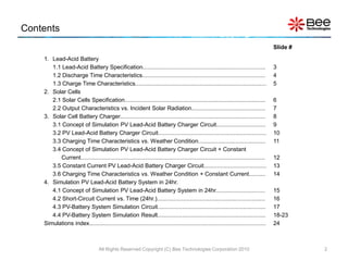 The document provides specifications and simulation results for a photovoltaic lead-acid battery system. It includes specifications for lead-acid batteries and solar cells, as well as simulation circuits and results for charging the batteries from the solar cells under different weather conditions over 24 hours. Key components are lead-acid batteries from GS YUASA, solar panels from BP Solar, and circuits to regulate charging and prevent overvoltage. Simulations examine effects of solar irradiance on charging time.