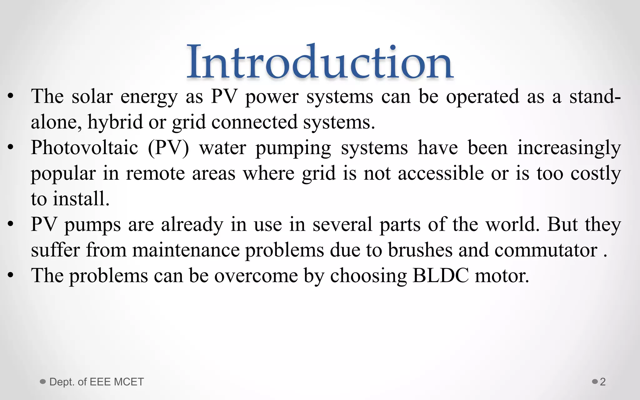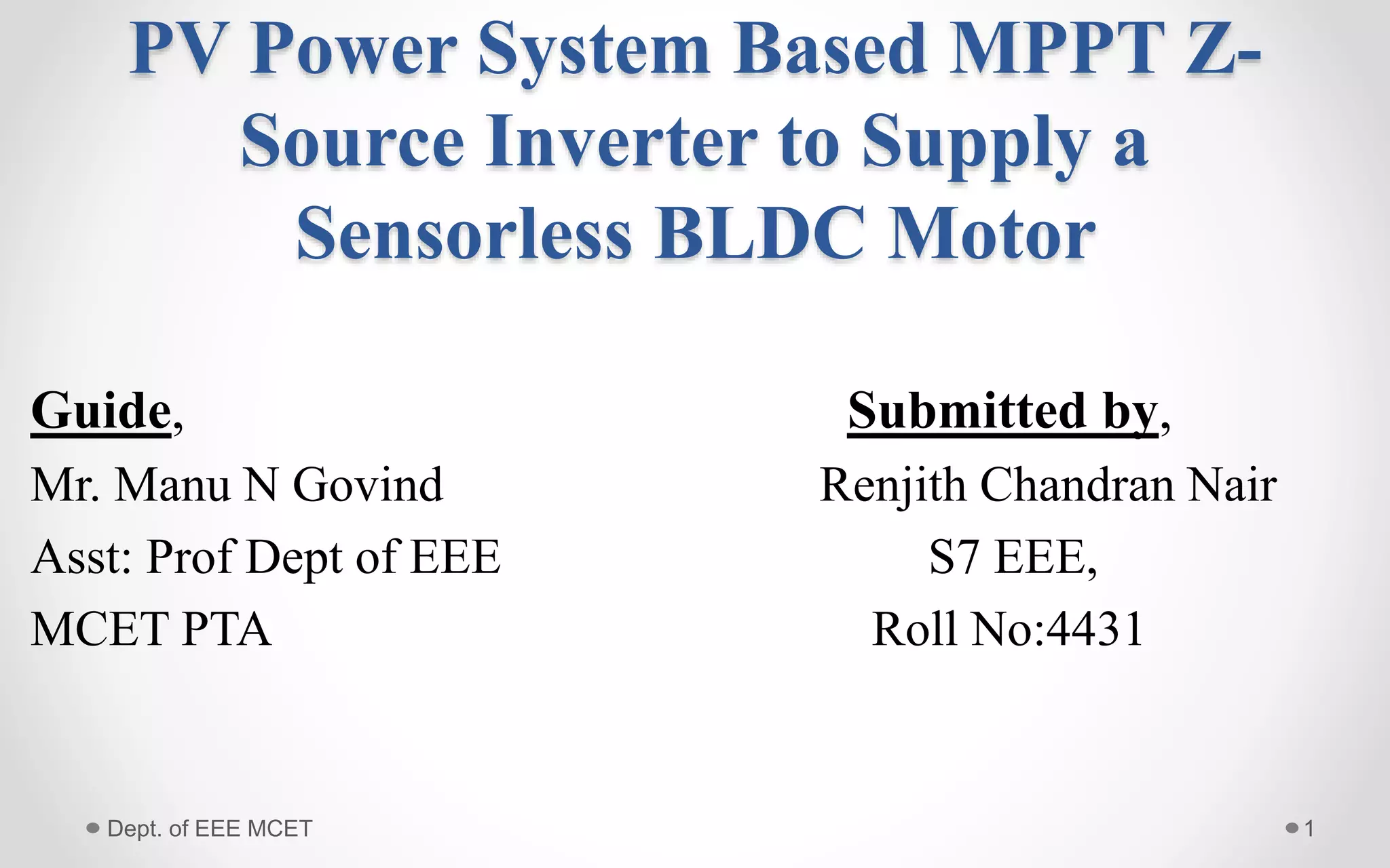 This document proposes a system using a photovoltaic array, maximum power point tracking, and a Z-source inverter to power a sensorless brushless DC motor. A PV array extracts solar energy and MPPT control maximizes the output power. A Z-source inverter can boost the PV voltage and supplies power to the BLDC motor. Simulation results show the system can successfully operate under different conditions and regulate motor speed while maximizing solar energy harvesting. The system has advantages of fewer power switches, smaller capacitors/inductors, and fast dynamic response compared to conventional PV systems.