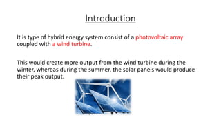 This document discusses PV-Wind hybrid systems which combine photovoltaic solar panels and wind turbines to generate electricity. Such hybrid systems are well-suited for locations where sunlight and wind availability vary seasonally. Key components include solar panels, a wind turbine, batteries, an inverter to convert DC to AC power, and instrumentation to monitor performance. Advantages are 24-hour power generation and reduced outage risks from multiple energy sources, while disadvantages include higher infrastructure costs and intermittent wind. Further research can improve performance and integration of renewable technologies.