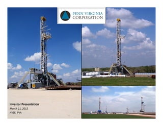 1. The presentation provides an overview of Penn Virginia Corporation (PVA), an independent oil and gas exploration and production company focused on oil and natural gas liquids plays like the Eagle Ford Shale.