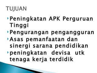Dokumen ini menjelaskan tentang program Pendidikan Vokasi Berkelanjutan (PVB) untuk SMK dan perguruan tinggi melalui pendidikan jarak jauh yang bertujuan meningkatkan kualitas tenaga kerja terdidik di Indonesia. Program ini melibatkan kolaborasi antara berbagai institusi pendidikan, pemerintah daerah, dan industri untuk mendukung pengembangan kurikulum serta menyediakan fasilitas belajar yang memadai. Pelaksanaan program termasuk sosialisasi, penerimaan mahasiswa, dan evaluasi untuk memastikan keberlanjutan dan relevansi pendidikan vokasi dengan kebutuhan pasar kerja.