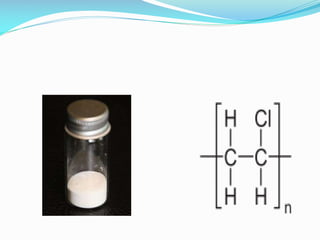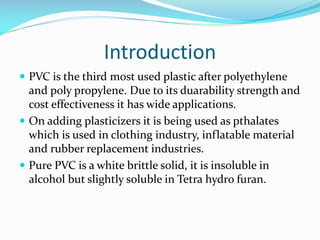 PVC is the third most widely used plastic. It was accidentally discovered in the 19th century when a white solid formed in flasks of vinyl chloride exposed to sunlight. PVC is produced via suspension or emulsion polymerization of vinyl chloride monomer. It has a linear structure and atactic stereochemistry. PVC has applications in pipes, cables, flooring and more due to its low cost, durability and resistance to chemicals and corrosion. However, it has disadvantages like difficulty recycling and sensitivity to heat and UV degradation.