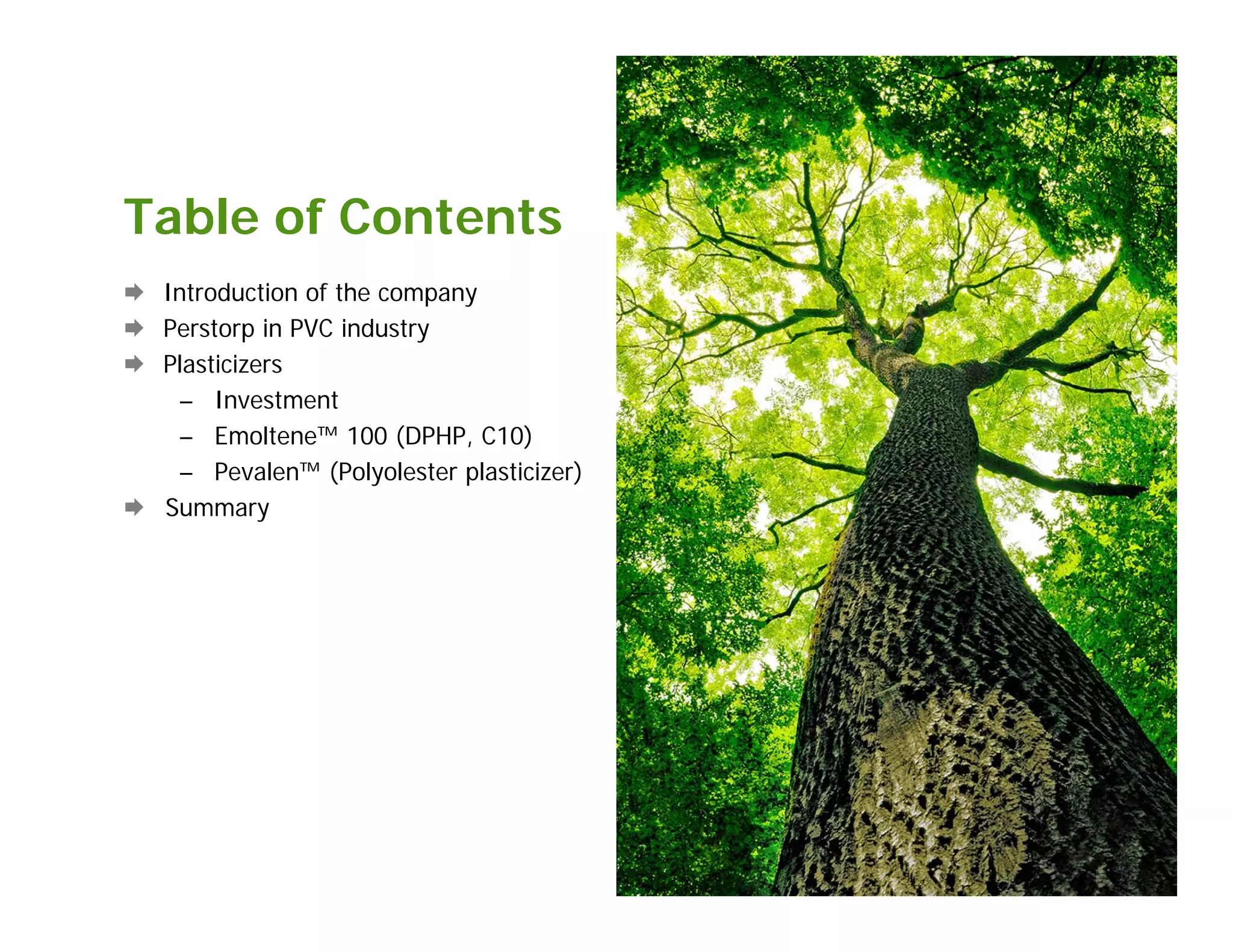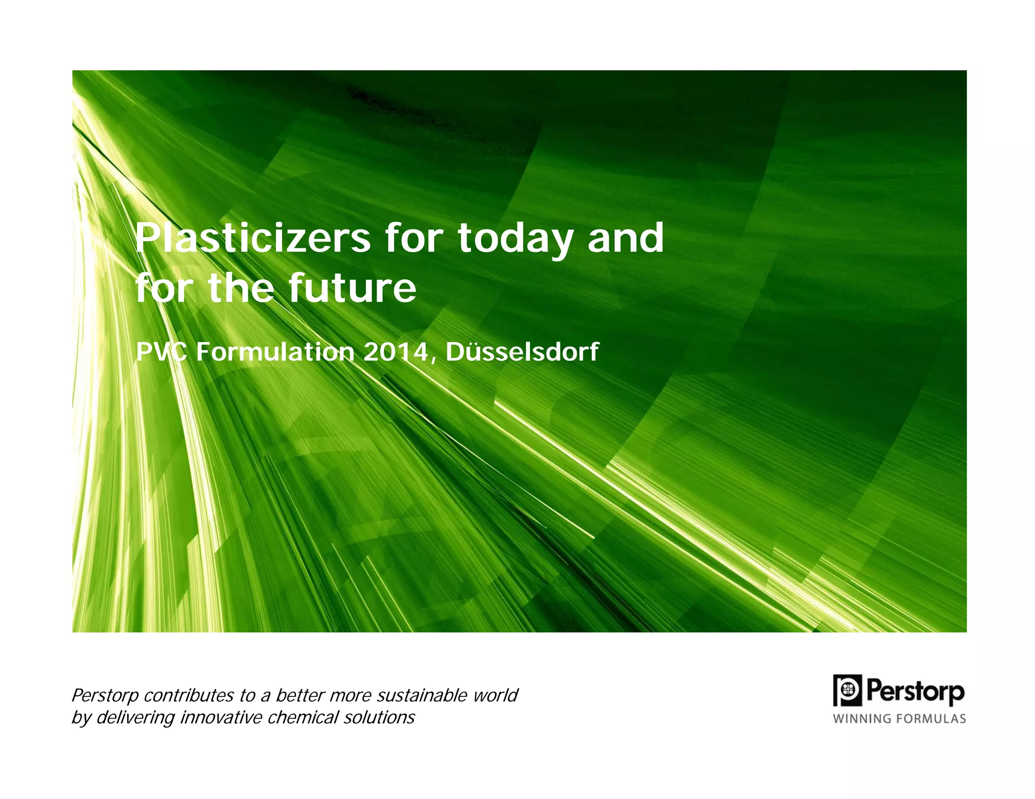 This document summarizes Perstorp's investments in new plasticizers. Perstorp is making its largest investment in history to produce two new plasticizers, EmolteneTM 100 and PevalenTM. EmolteneTM 100 is an established C10 plasticizer that provides durability for applications like cables and films. PevalenTM is an innovative polyolester plasticizer that is highly efficient while having low volatility, ensuring consistent properties. The new production capacity of 150,000 MT per year will strengthen Perstorp's platform and allow them to offer competitive and sustainable plasticizer products.