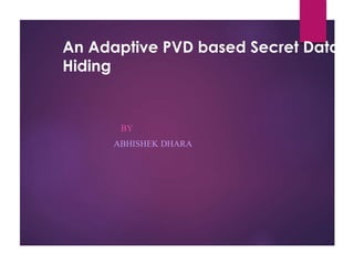 This document discusses an adaptive pixel value differencing (PVD) based secret data hiding technique. It begins with an introduction to steganography and some common steganography techniques. The proposed method aims to embed most data into edged areas of an image since there are larger pixel differences, increasing embedding capacity. It implements a PVD-based embedding and extraction algorithm. Experimental results on Lena and Baboon images show increased payload and acceptable stego image quality compared to LSB substitution. The proposed method effectively and efficiently embeds hidden information imperceptibly into cover images.