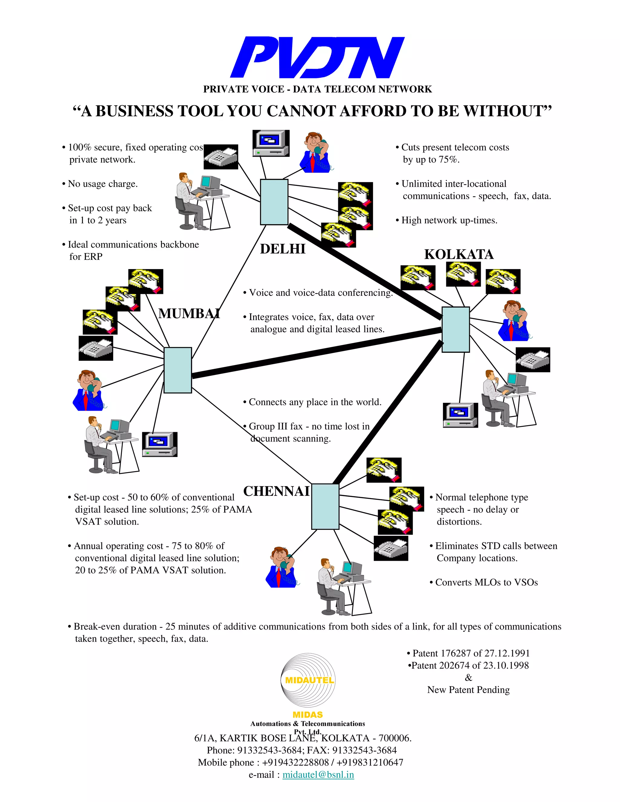 The document discusses the benefits of a private voice-data telecom network (PVDTN) system. It outlines how PVDTN can save organizations up to 75% of present telecom costs, improve decision making and security, and virtually convert multi-location organizations into single offices. The document provides diagrams illustrating sample network configurations and topologies that can be implemented using PVDTN to integrate voice, fax and data communications across locations.
