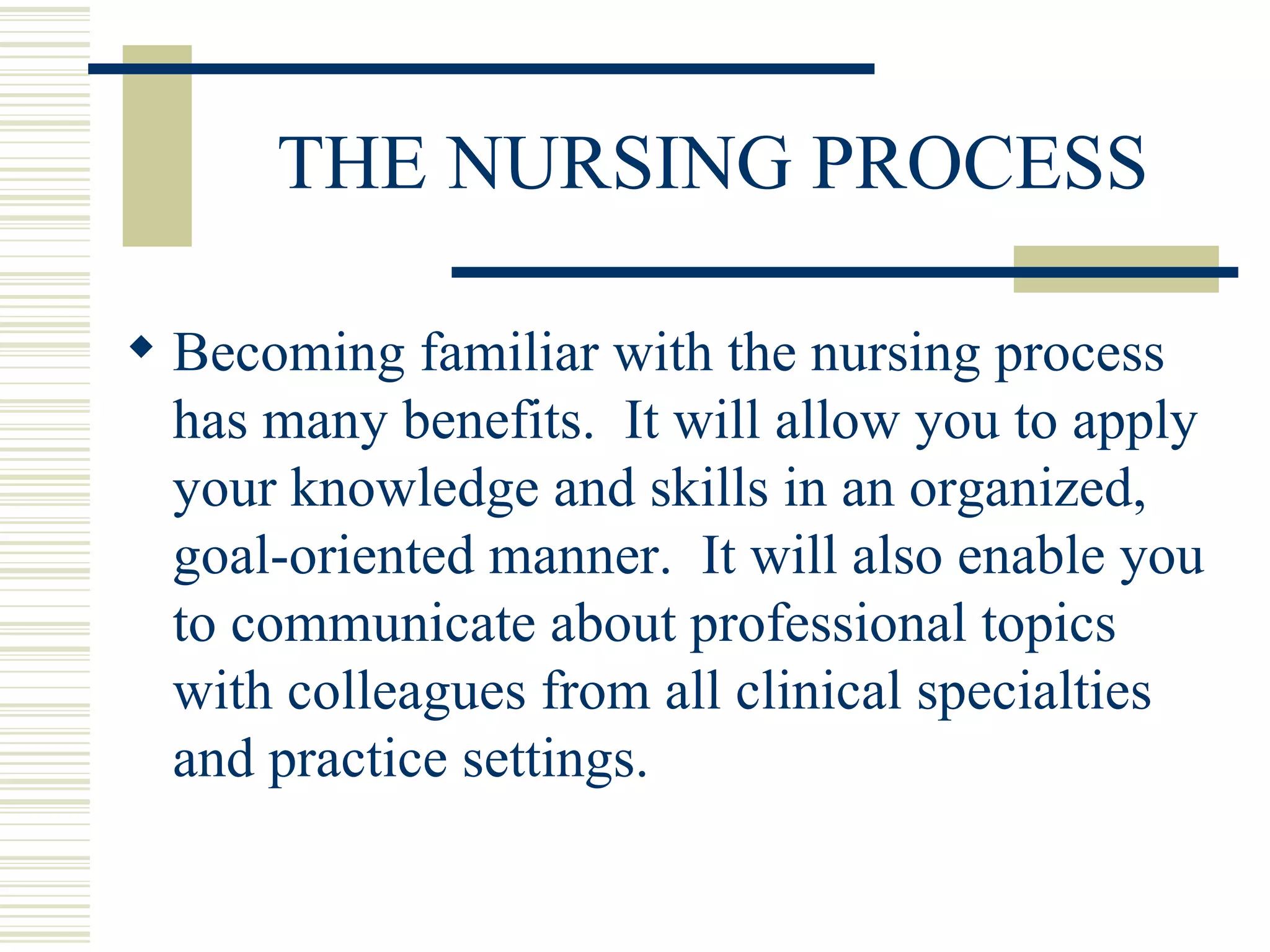 The document outlines the nursing process, which consists of assessing, diagnosing, planning, implementing, and evaluating patient care. It emphasizes the importance of each phase in providing quality and individualized nursing care, while also distinguishing the roles of nursing diagnoses from medical diagnoses. Furthermore, the document highlights the significance of effective communication and documentation in nursing practice to ensure continuity of care and professional autonomy.