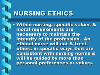 1) Ethics is concerned with determining norms and standards to establish good conduct beyond personal preferences. Within nursing, specific ethical values and requirements are necessary to maintain integrity.