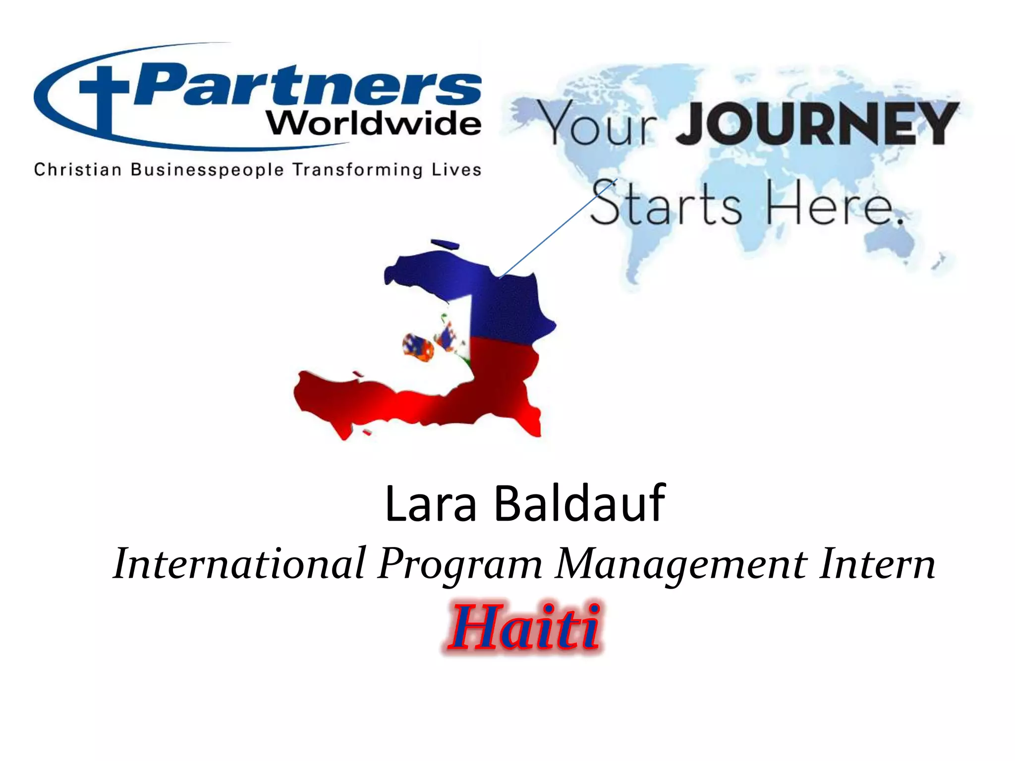 Lara Baldauf is an international program management intern working with Partners Worldwide in Haiti. Her role involves assessing training needs, assisting with organizational development of local business affiliates, gathering business profiles, facilitating communication, and project managing a website for a 100,000 jobs initiative in Haiti. The initiative aims to connect businesses, NGOs, churches and partnerships to grow enterprises and create sustainable jobs by 2020. As an intern, Lara is seeking global business affiliates to partner with local businesses and provide mentoring, as well as financial supporters and those interested in following the work.